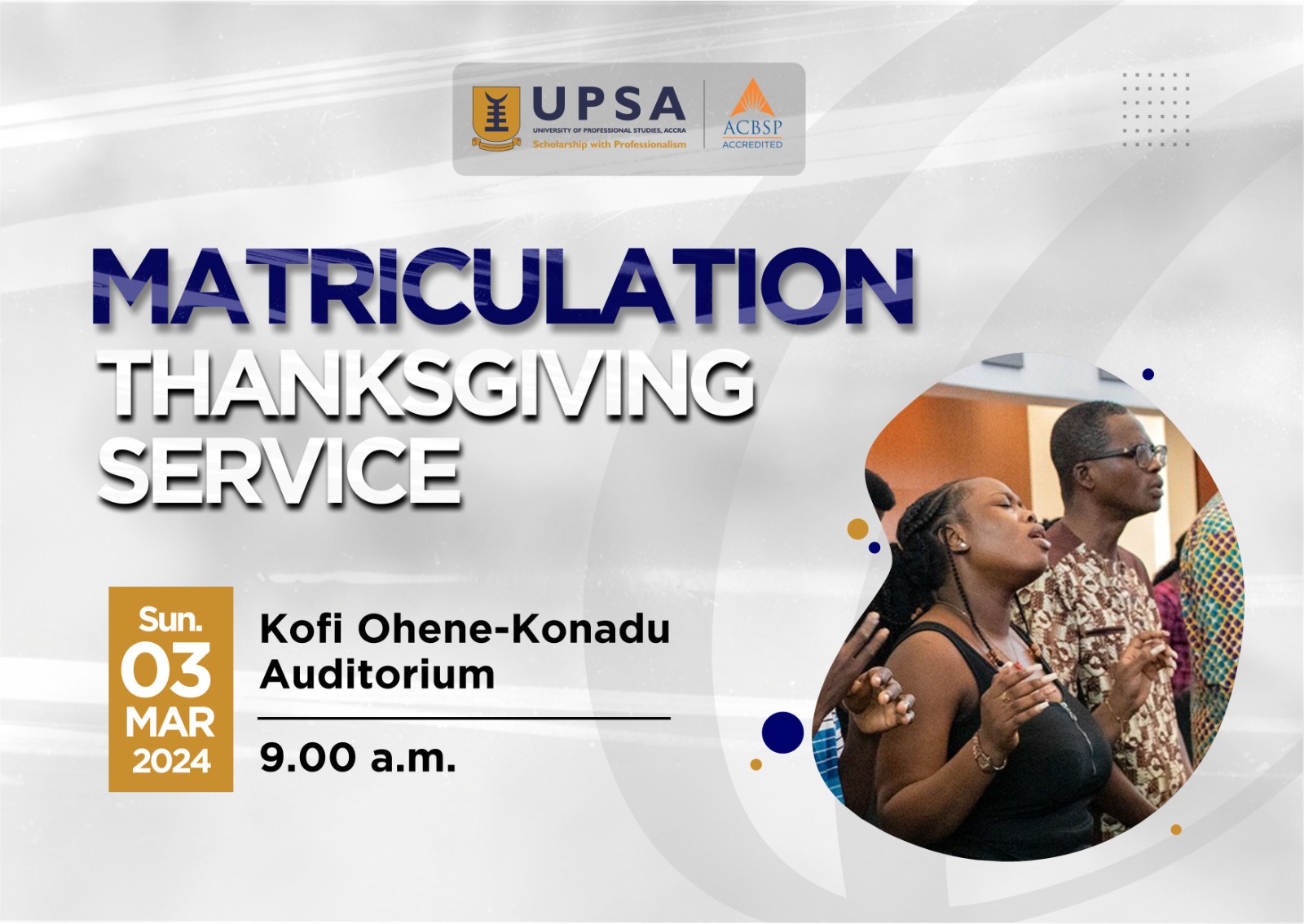 The Chaplaincy Unit of the University of Professional Studies, Accra is pleased to invite all undergraduate, diploma, and postgraduate (January Intake) fresh students to attend the 2024 matriculation thanksgiving service to be held as follows: