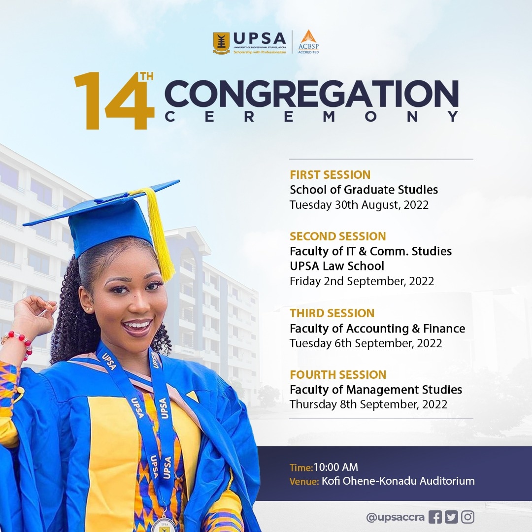 The University of Professional Studies, Accra (UPSA) announces for the information of the 2022 graduands and the general public that the Fourth of the 14th Congregation Ceremony of the University to award degree and diploma certificates to persons who successfully completed their programmes of study in the   2021/2022 academic year will be held as follows: