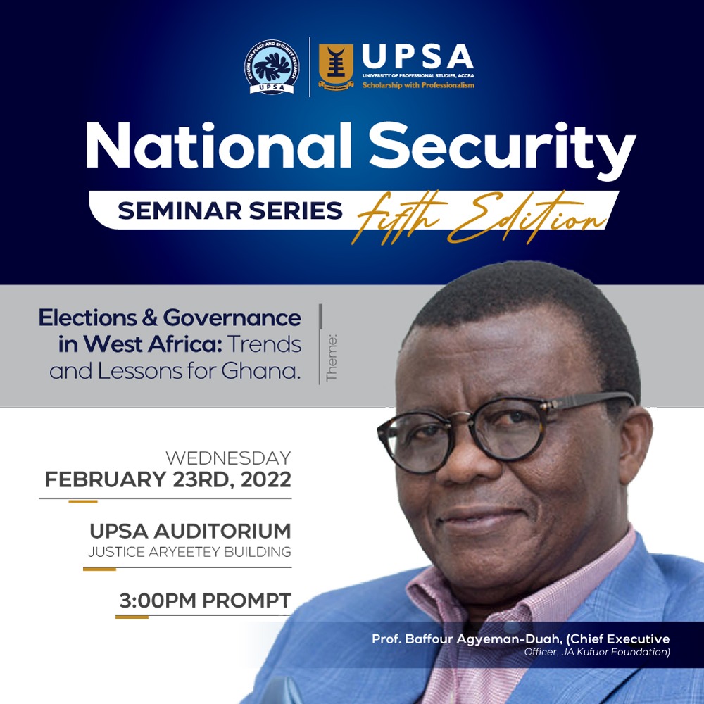 The Centre for Peace and Security Research at the University of Professional Studies, Accra (UPSA) is pleased to present the fifth edition of the National Security Seminar Series on the theme: “Elections & Governance in West Africa: Trends and Lessons for Ghana”.