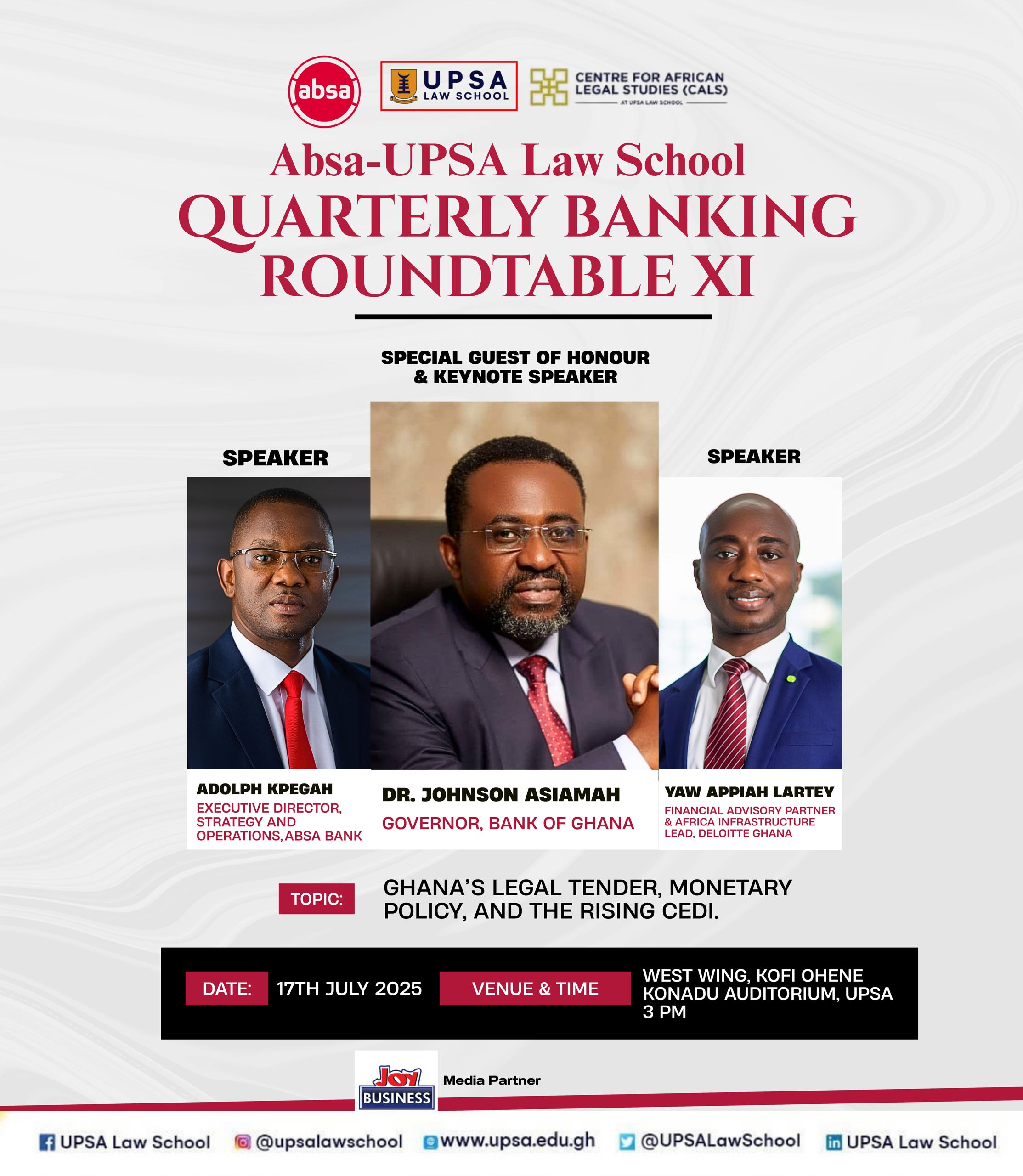 The UPSA Law School, in collaboration with Absa Bank, invites you to the 11th edition of the Quarterly Banking Roundtable — a high-level forum bringing together leading voices in Ghana’s financial and legal sectors.