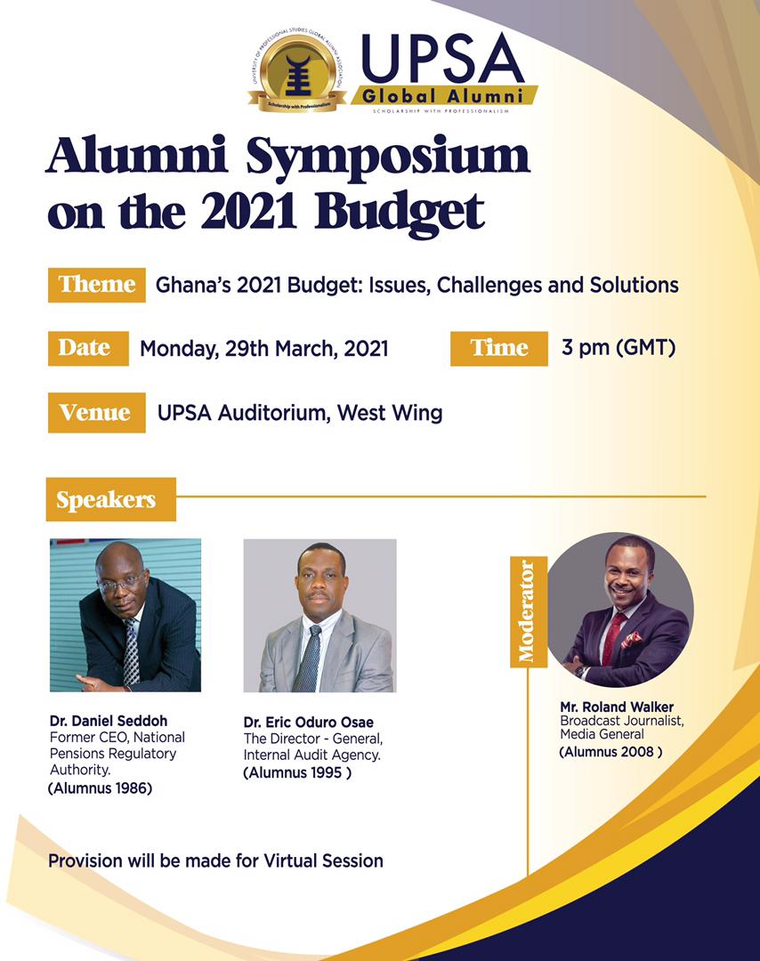 The Global Alumni Association of the University of Professional Studies, Accra warmly invites the University community and the general public to a Symposium on the 2021 budget.