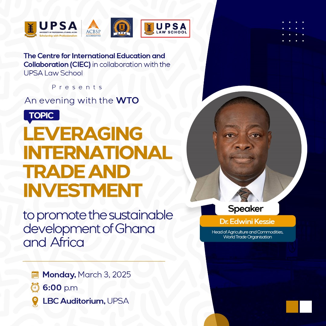 The Centre for International Education and Collaboration (CIEC) in collaboration with the UPSA Law School cordially invite members of the university community to an evening with the World Trade Organisation (WTO).
