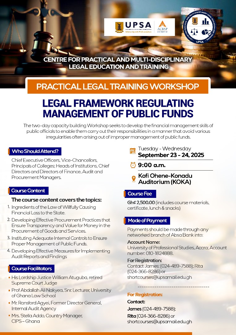 The Centre for Practical and Multidisciplinary Legal Education and Training (CPMLET) is excited to present the Practical Legal Training Workshop on the Legal Framework Regulating the Management of Public Funds.