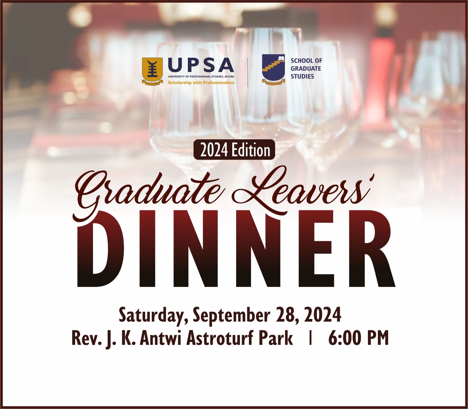 The UPSA School of Graduate Studies cordially invites all 2024 graduating students to the annual Graduate Leavers’ Dinner. This special event is designed to celebrate your academic achievements and mark the beginning of new chapters in your professional journeys.