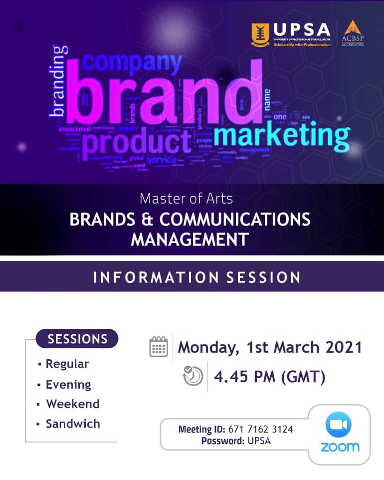 The Faculty of Management Studies of the University of Professional Studies, Accra is pleased to invite prospective students and the general public to its maiden Information Session on the Master of Arts in Brands & Communications Management programme.