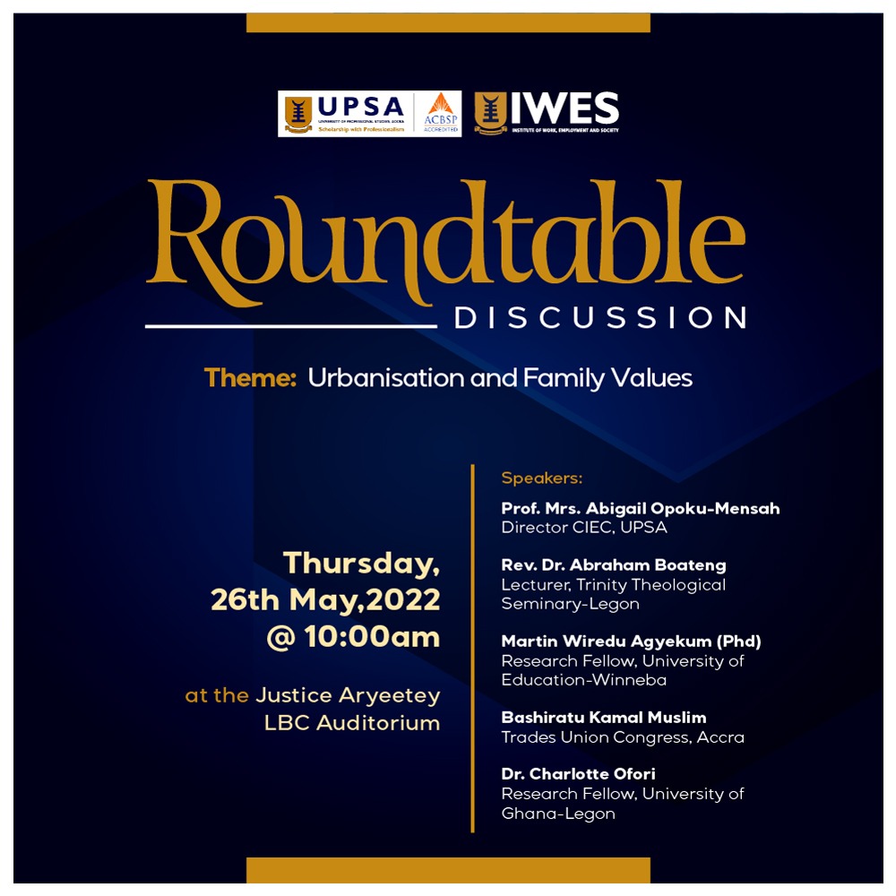 The Institute of Work, Employment and Society (IWES) of the University of Professional Studies, Accran warmly invites the University Community to a Roundtable Discussion on the theme, “Urbanisation and Family Values“.
