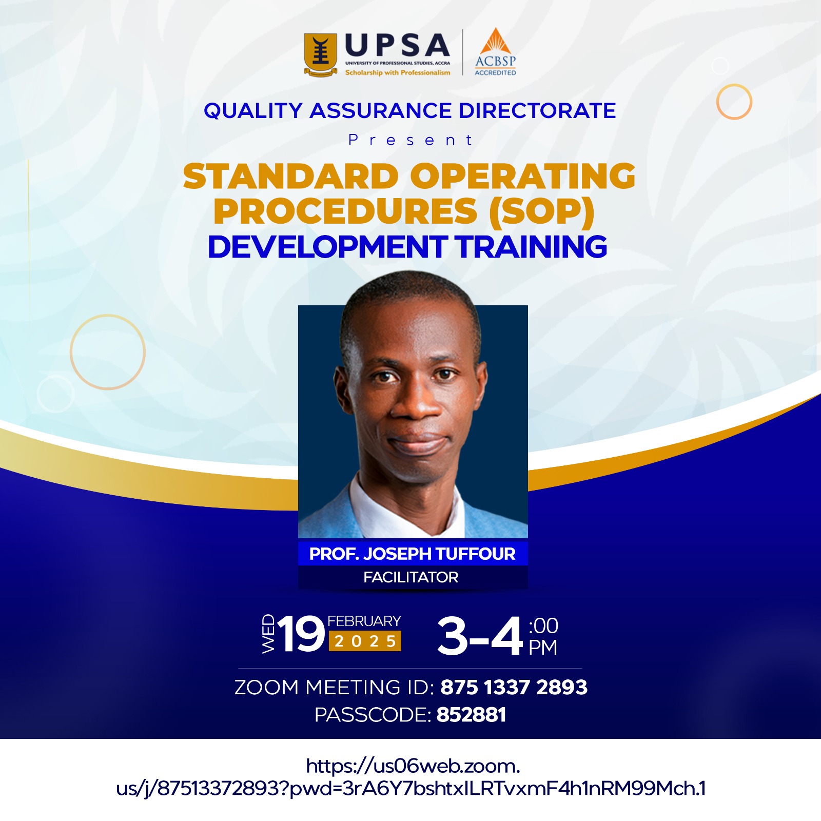 The Quality Assurance Directorate of the University of Professional Studies, Accra (UPSA) is organising a one-day training program on the development of Standard Operating Procedures for all senior staff and heads of units.