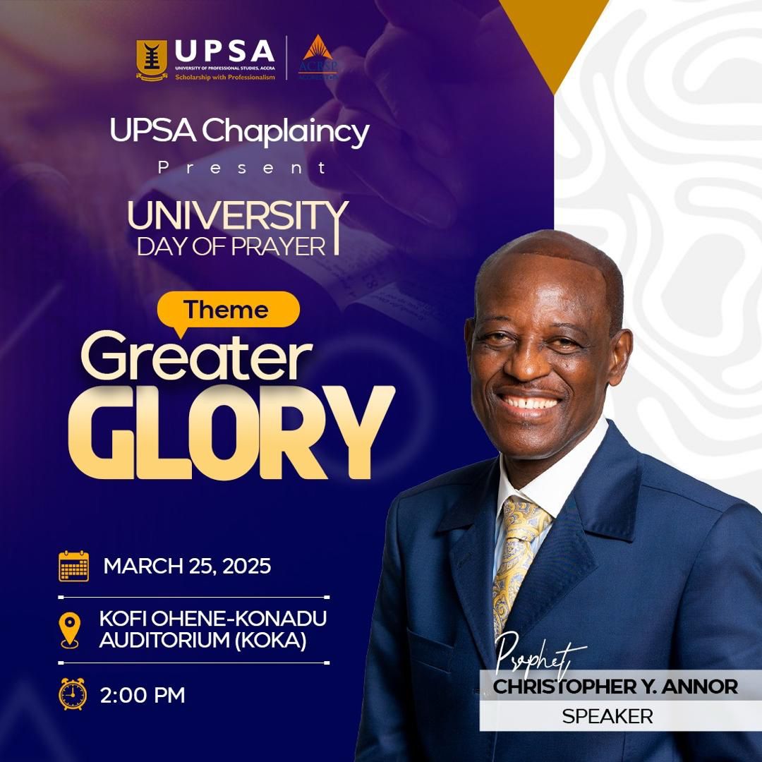 The Chaplaincy Unit of the University of Professional Studies, Accra is excited to present the 2025 University Day of Prayer with Prophet Christopher Yaw Annor.