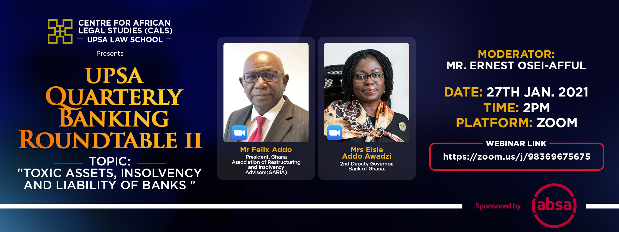 The Centre for African Legal Studies (CALS) of the UPSA Law School warmly invites the University Community and the general public to its quarterly Banking Roundtable II under the theme Toxic Assets, Insolvency and Liability of Banks.