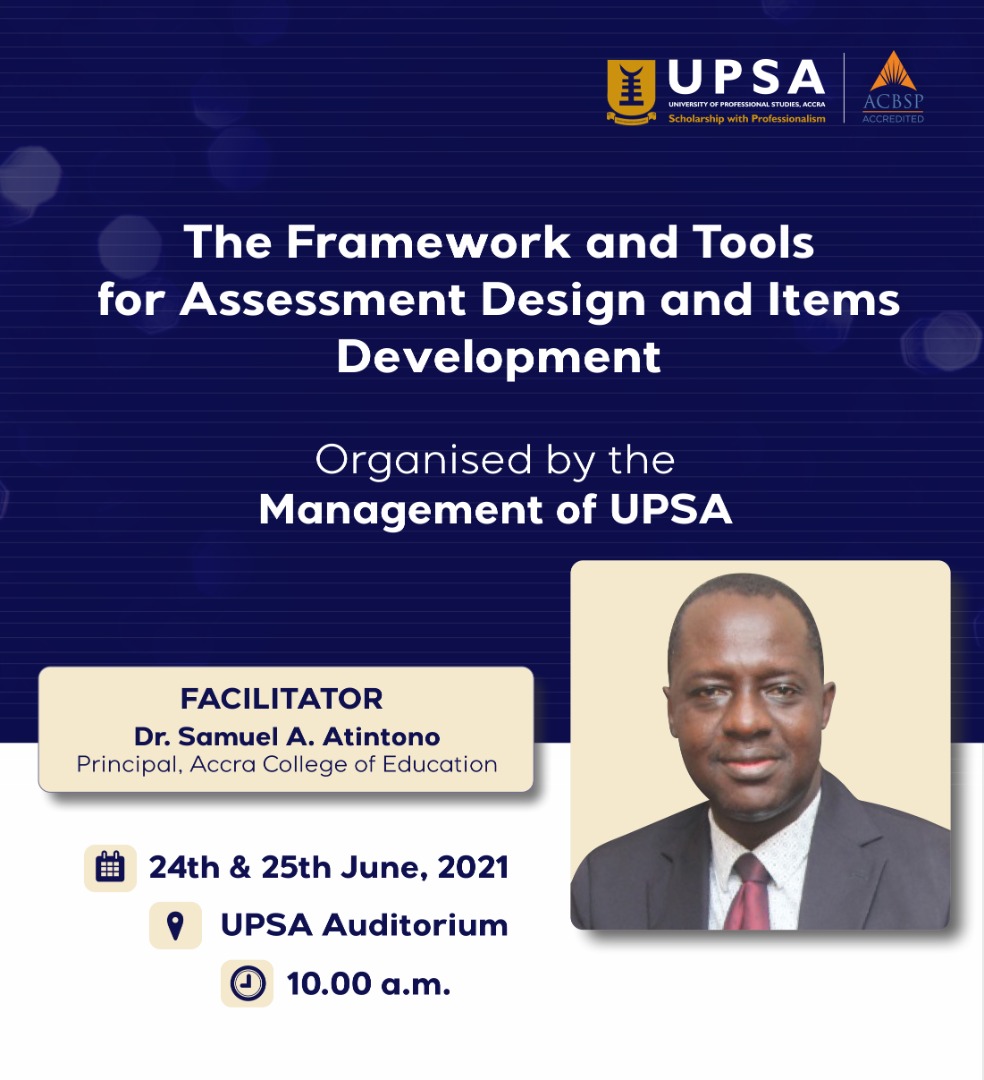 The Management of the University of Professional Studies, Accra warmly invites all faculty members to a two-day Workshop on the Framework and Tools for Assessment Design and Items Development.