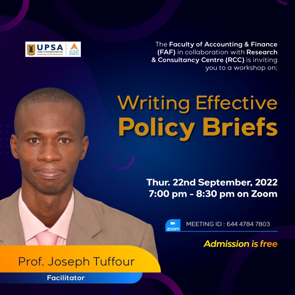 The Faculty of Accounting and Finance (FAF), in collaboration with the Research and Consultancy Centre is pleased to invite members of the University Community to a workshop on Writing Effective Policy Briefs.